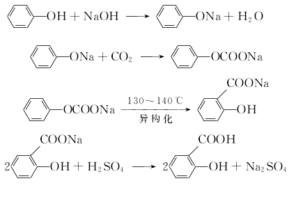 1.  酚與氫氧化鈉反應生成酚鈉,蒸餾脫水后,通二氧化碳進行羧基化反應,制得水楊酸鈉鹽,再用酸化,而得粗品。粗品經升華精制得成品。原料消耗定額:酚(98%)704kg/t、燒堿(95%)417kg/t、(95%)500kg/t、二氧化碳(99%)467kg/t。該法分為常壓法和中壓法。(1)常壓法    將酚與50%的氫氧化鈉溶液配制成酚鈉,使游離堿在1%以內,減壓脫水后,加酚作溶劑共沸脫水。然后酚鈉在溶劑酚中通入干燥的二氧化碳羧化,再用酸化即得成品。